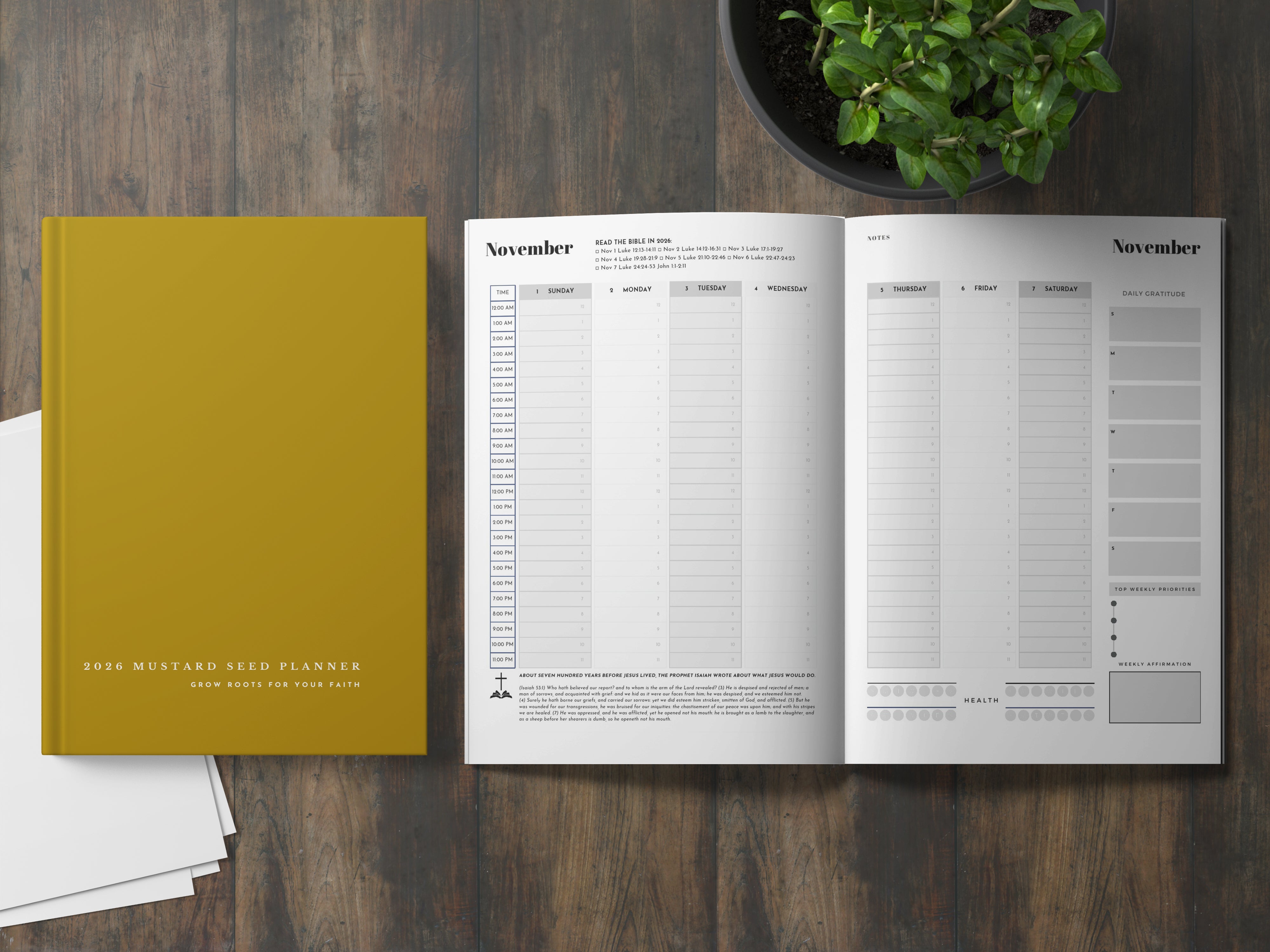The Mustard Seed Planner isn’t just a planner — it’s your all-in-one faith + life tool. With a built-in Bible-in-a-year plan and weekly studies, it helps you balance family, career, health, and faith while encouraging gratitude, prayer, and creativity every single day.